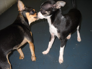 We have two new puppies at daycare today. First of all, say hello to Kirby (black & white chihuahua, pictured above with his new chi sister, Paris (sticking out her tongue at him), and with Mika (B&W chi in the background).